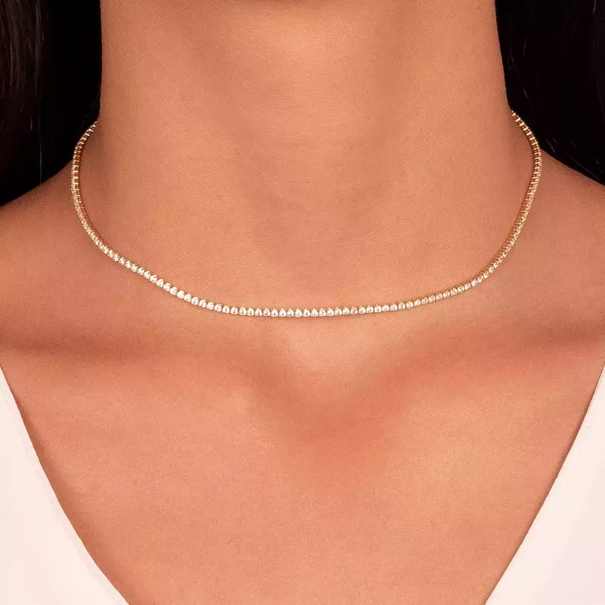 Descubra o charme desta choker delicada, banhada em ouro 18k e cravejada com zircônias que refletem um brilho intenso e elegante. Nossa peça hipoalergênica e níquel free, com camada exclusiva de Verniz Extra Brightness, garante conforto e durabilidade incomparáveis. Ideal para quem busca um acessório que une glamour e proteção para a pele.